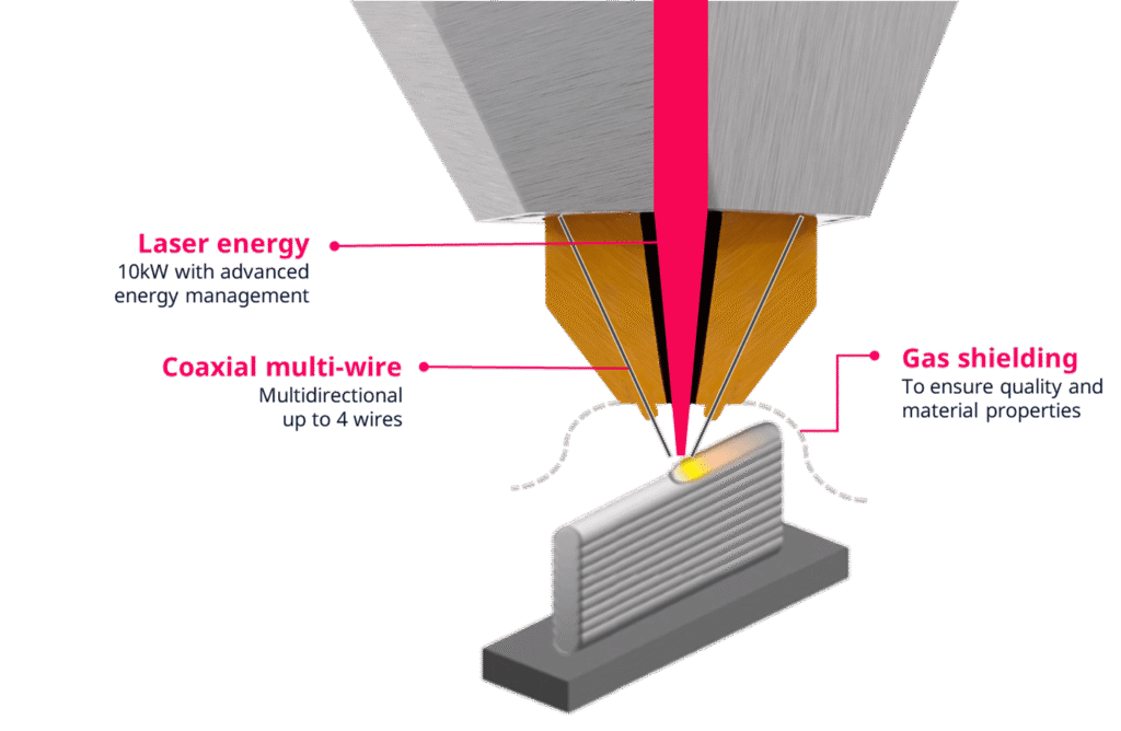 The laser melts the material continuously. Dynamic energy management ensures the best melting conditions for the specific material and deposition configuration. The high metallurgical quality of the laser process is now available for high volume production. Energy management and wire feed are managed independently, making the technology extremely robust. In addition, AMFREE technology has an ultra-wide operating window.
